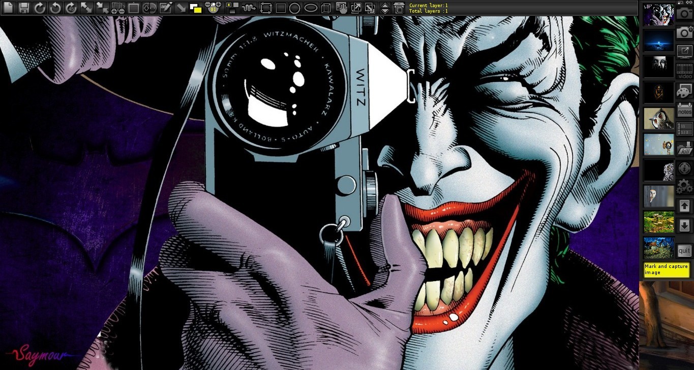 Capture images with timer, for example: pop-ups. Image composer mode with infinite layers to put images, texts or graphic primitives. Scale, rotate, put border, change contrast, add transparency, use text or arrows in the collage mode.
